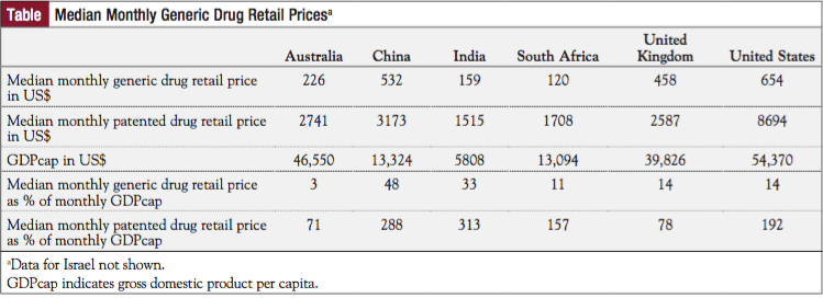 Drugs of both types were most affordable in Australia. The United States had the highest median monthly prices for drugs—both generic and patented—but ranked 5th in affordability per capita for patented drugs, behind Australia, the United Kingdom, Israel, and South Africa, and tied with the United Kingdom for 4th for generic drugs, behind Australia, Israel, and South Africa. Drugs were least affordable in India and China, with China the highest for patented drugs and India the highest for generic drugs. (TABLE 1)