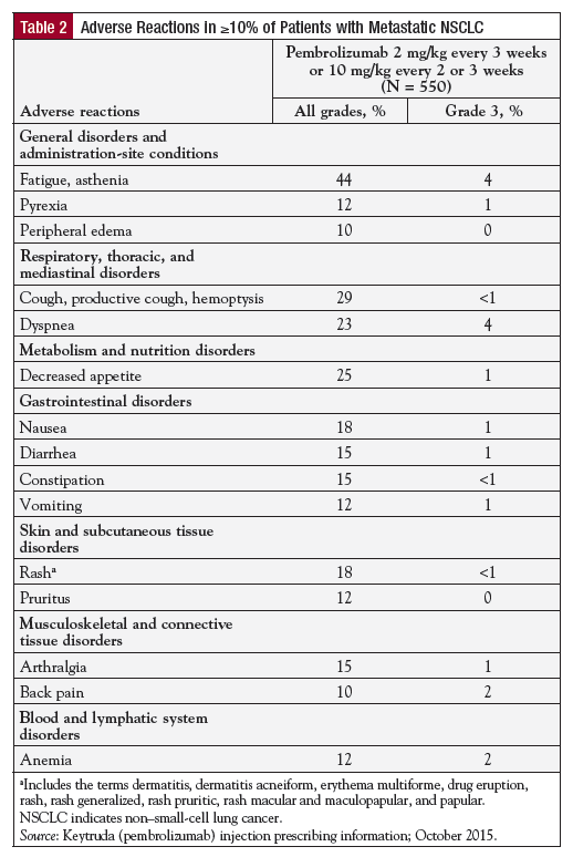 Among the 550 patients with previously treated metastatic NSCLC in KEYNOTE-001 who received pembrolizumab, the median duration of therapy was 2.8 months (range, 1 day to 25.6 months).10 Adverse reactions reported in at least 20% of patients included fatigue, decreased appetite, dyspnea, and cough (Table 2).10