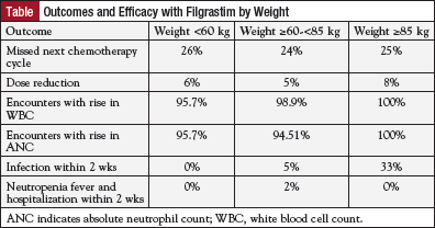 The researchers compared chemotherapy-induced neutropenia-related complications in patients with a higher weight (>60 kg), for whom 300 µg would be considered a suboptimal dose, versus patients weighing <60 kg, for whom a 300-µg dose would be recommended. The medium-weight and high-weight groups, who were presumably receiving subtherapeutic doses, were the cohorts of interest.